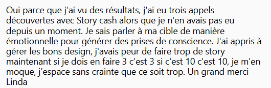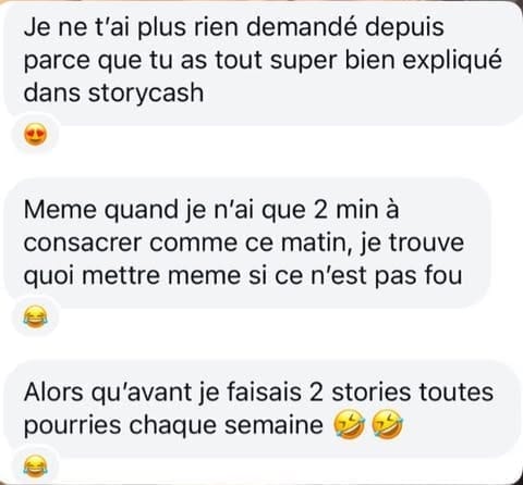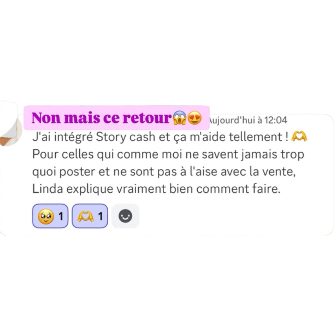 " Je recommande à 1000% pour toute personne qui veulent vendre en story et convertir. J'ai repris goût à créer et a être présente en story alors que j'avais complètement perdu toute motivation. Maintenant je sais exactement quoi dire et comment pour activer mon audience."